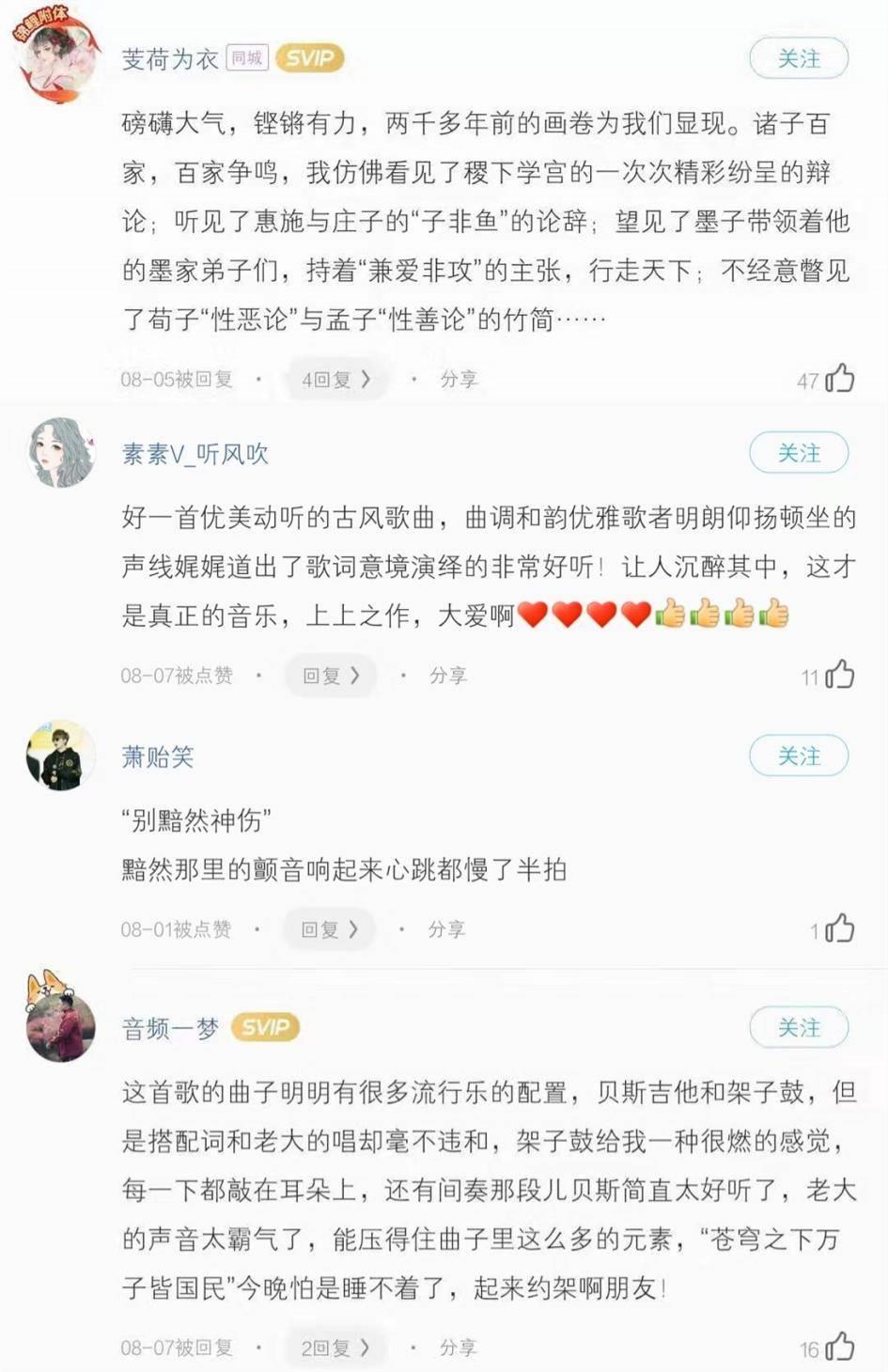 逐步上线的四首单曲每一作都在酷狗音乐收到了乐迷们的热烈回应,有人说萧忆情Alex为息夫人唱的颤音太伤情,让“心跳都慢了半拍”,也有人说音频怪物霸气的歌声太燃,听得自己“今晚怕是睡不着了”,还有不少网友直接在评论区聊起了历史思想与变革。可以说,汐音社的这次企划在音乐和文化两个领域都获得了很不错的成绩。