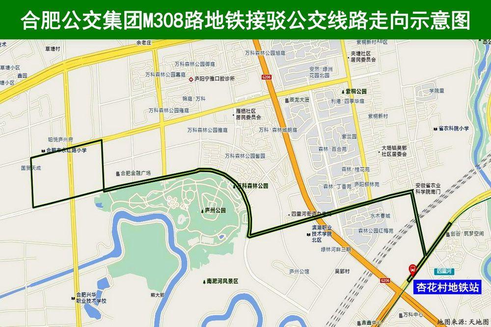 合肥公交集团M308路地铁接驳公交线路走向示意图。
