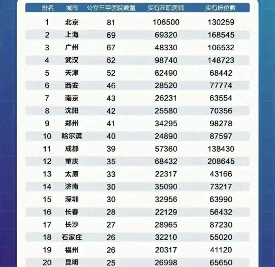 根据公立三甲医院数量城市排行榜数据,上海拥有69家三甲医院,仅次于首都北京。