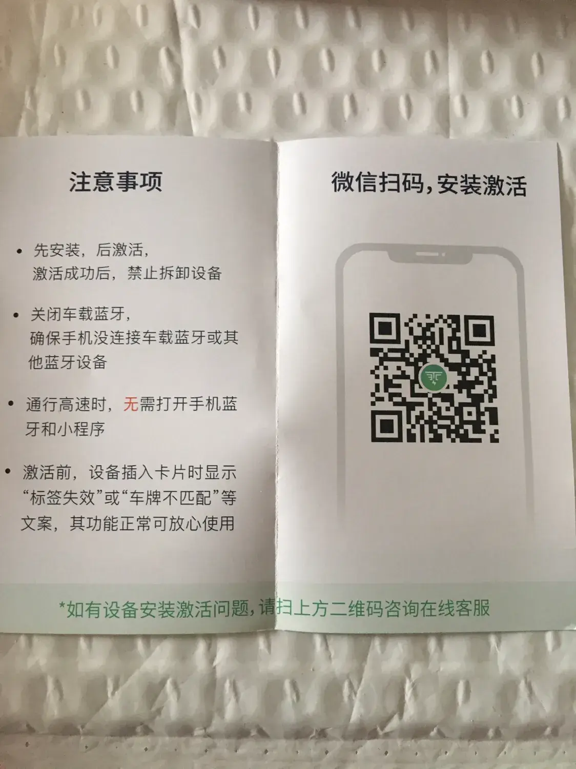 安装好后就是激活,也挺简单。把卡插进去抽出来在插进去,设备显示蓝牙已开,打开手机蓝牙,然后在微信etc助手点击开始激活,等待大概20秒,提示激活成功。