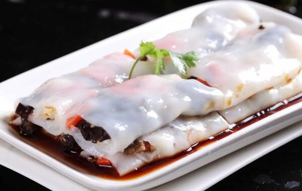 广东肠粉:肠粉是广东地区的特色小吃,它呈透明状,口感q弹,搭配用酱油、蚝油、花生酱等调配而成的酱料以及生菜、豆芽、肉末、香菇、虾米等配菜,味道鲜美,令人回味无穷。由于肠粉口味独特,久而久之便流传到了全国各地。