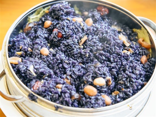农历四月初八,武夷山有制作乌米饭供奉的习俗,祈求一年风调雨顺。当然现在在餐厅里也都能点上这一道乌米饭。采摘野生乌稔树的叶子,放到石臼里捣碎,取紫黑色的汤汁浸泡糯米,待12小时左右糯米吸饱汁水变成蓝黑色,方可捞起放到木甑里炊制。配上咸肉、花生、红枣、香菇等佐料,蒸熟的乌饭油黑透亮、软糯爽口,透着一股清香,能让人食欲大增。
