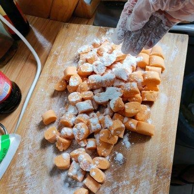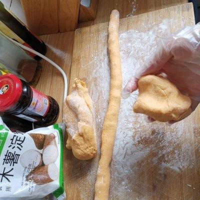 2、趁热,加一点糖,揉在一起,然后红薯放木薯芋圆淀粉揉一起。不能红薯成团就加一点点开水。 木薯淀粉和红薯泥比例1:1-1:2,我放的1:1.2左右,我用的三个适中大小的红薯,用了一包200g的木薯淀粉,大概用了150g。不是很Q弹,木薯淀粉可以做什么吃,偏软糯,下次还是多放点淀粉,木薯淀粉可以做芋圆吗。 注意:记得多戴两层手套,戴一个烫手