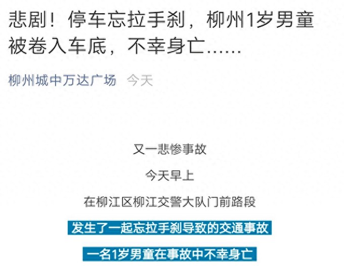6月11日,柳州城中万达广场官方微信公众号发布《悲剧!停车忘拉手刹,柳州1岁男童被卷入车底,不幸身亡……》一文,引发社会热议。