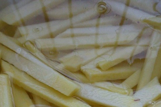 将土豆去皮之后切成条状,放在清水中浸泡30分钟,中途可以持续换水,这样就可以避免土豆条在油炸的过程中炸糊了。将泡好的土豆用热水煮一下,煮至土豆变透明状态即可。