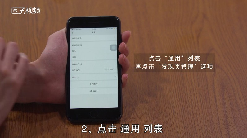 2、点击“通用”列表,再点击“发现页管理”选项。