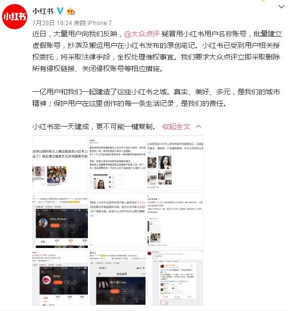 7月29日,大众点评就小红书及小红书内容作者投诉其未经授权大量“搬运”小红书达人账户及原创内容一事作出回应,称其接到投诉后大众点评立即采取相关技术措施,在7月27日完成所有内容排查与全部清理下线,并通过技术手段确保该类问题不再出现。