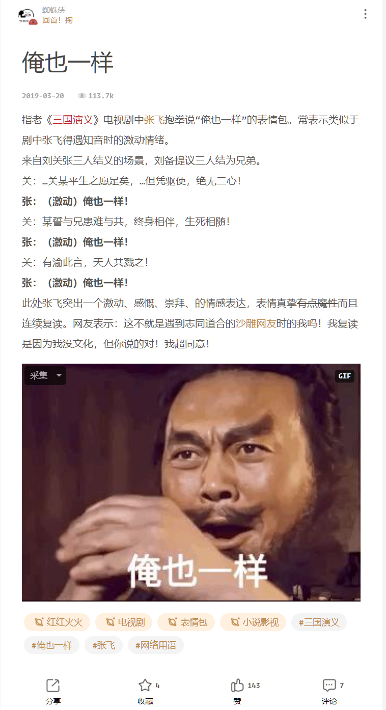 指老《三国演义》电视剧中张飞抱拳说“俺也一样”的表情包。常表示类似于剧中张飞得遇知音时的激动情绪。来自刘关张三人结义的场景,刘备提议三人结为兄弟。关:…关某平生之愿足矣,…但凭驱使,绝无二心!