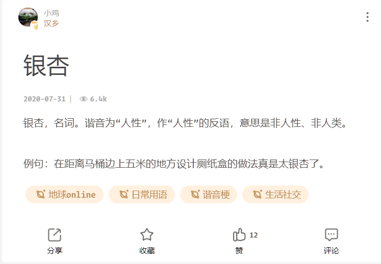 银杏,名词。谐音为“人性”,作“人性”的反语,意思是非人性、非人类。例句:在距离马桶边上五米的地方设计厕纸盒的做法真是太银杏了。