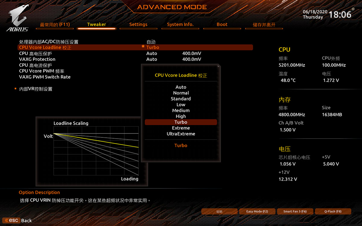 CPU Vore Loadine校正这个防掉压选项最好也手动改一下,不同主板厂商的BIOS会有不同的档位设置,我们手头上这块Z490 AORUS MASTER用Turbo档位最终得出来的电压是最接近我手动设置电压的,开高了的话主板会自动加压,低了的话就会掉压。
