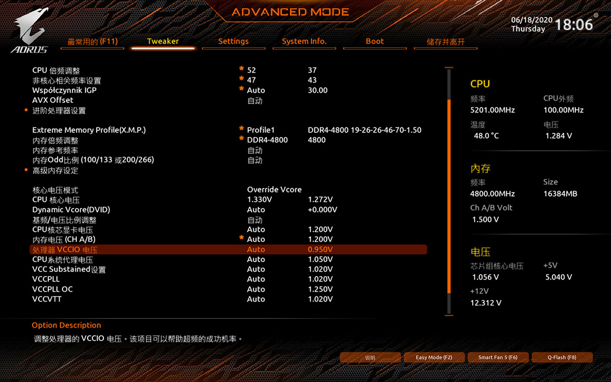 开了XMP之后你会发现VCCIO与VCCSA主板会帮你自动加得很高,这个得看情况改动,大部分情况你其实不需要改,但如果觉得CPU温度高了许多可以略微向下降一下电压,但也有例外的情况,如果XMP的频率非常高的话电压也有可能不够。