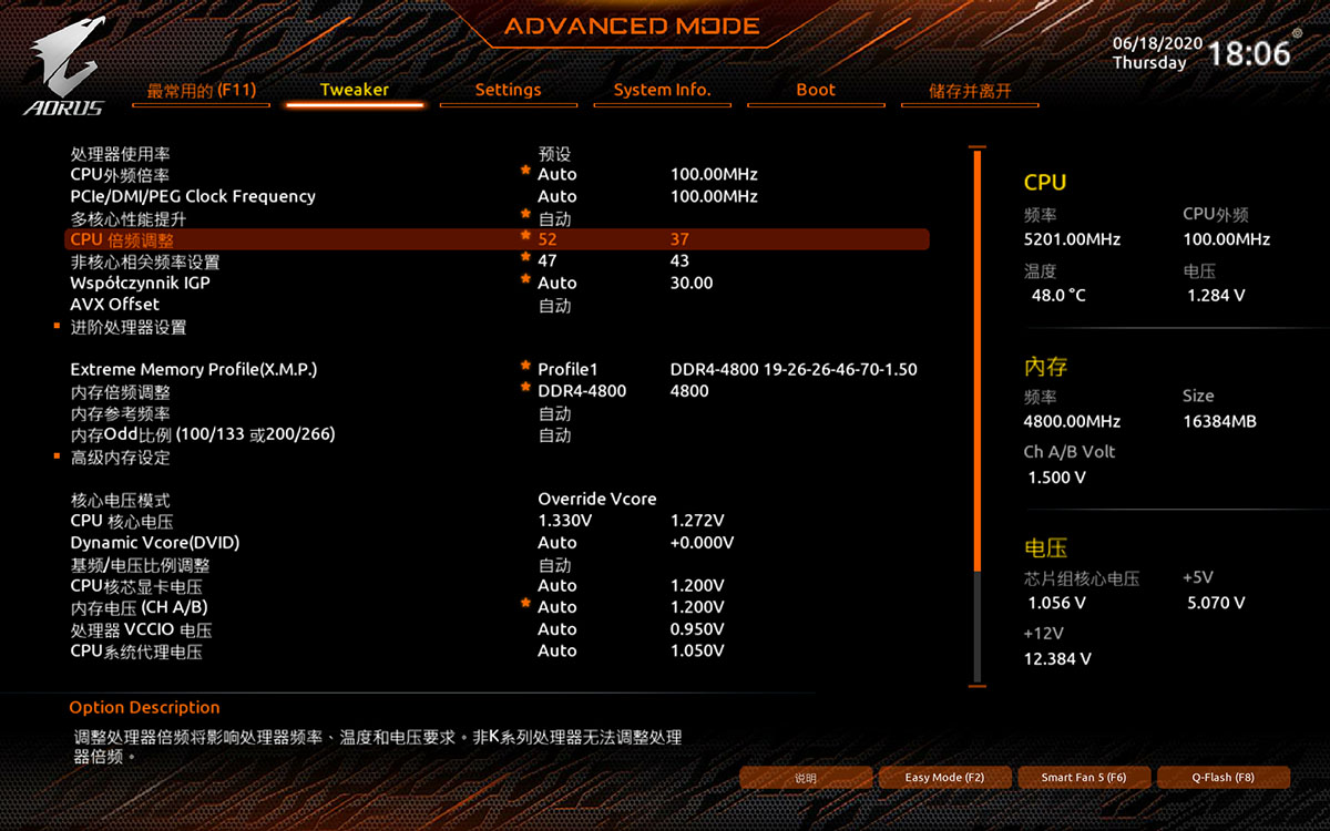 如何超一个Core i9-10900K?简单来说就是开机狂按Delete键进入BIOS,然后找到CPU倍频调整这个选项,把Auto改成52,最后按F10退出并保存就行了。当然这是最简单的方法,实际上这样干很容易就会出现主板自动把电压加过高然后CPU温度爆高,甚至会过热死机,或者主板给的电压不够进系统后蓝屏死机,以上现象基本上二选一,除非你运气真的很好,主板帮你把电压加得刚刚好,这种情况极少见,所以我们还是要手动去改CPU电压。