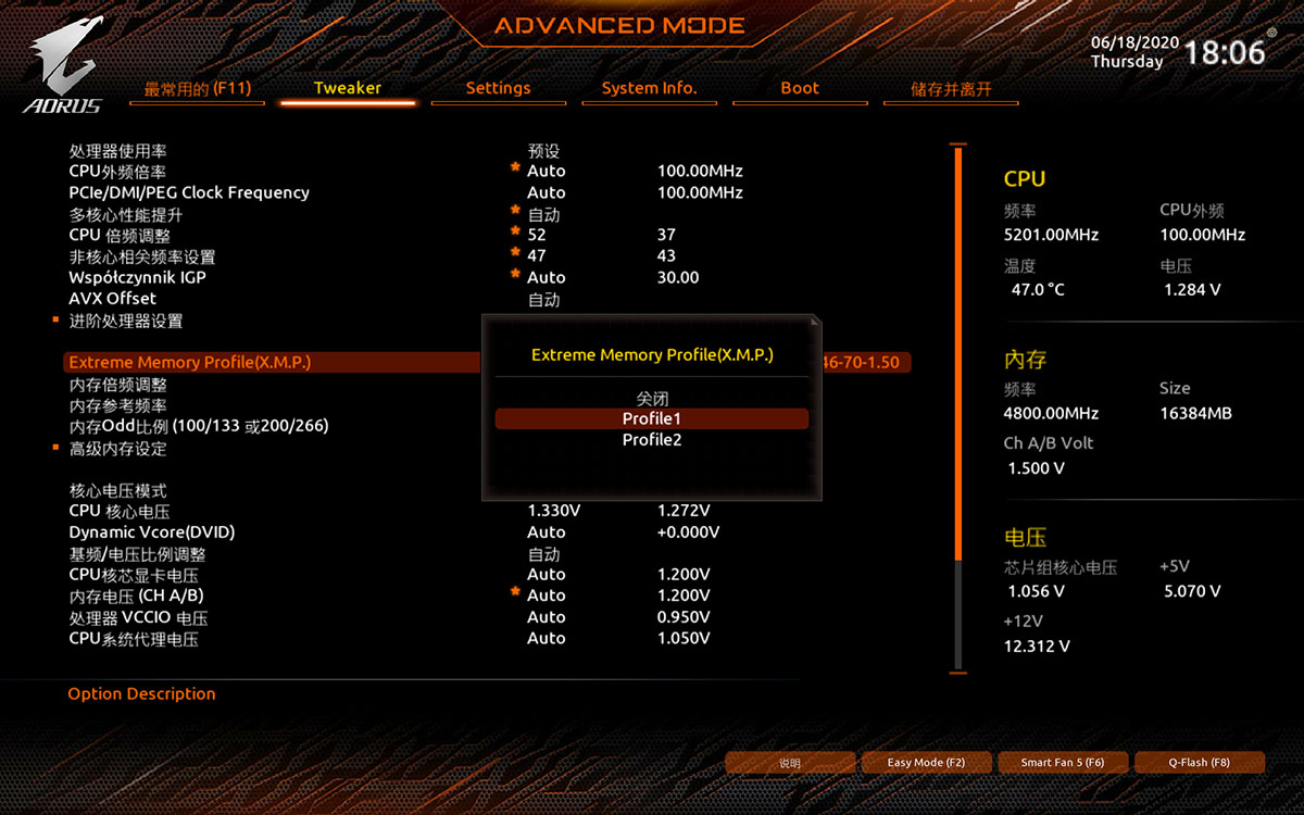 开启XMP的方法也很简单,在BIOS里面找到这个选项然后选Profile就行了,现在的内存基本上都支持XMP 2.0,会有两个Profile,所以得看下哪个频率高一点,不过有些内存两个Profile的设置是一样的。