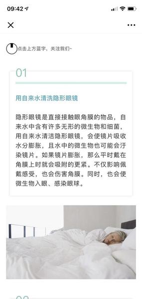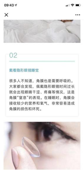 再一个 很多人还戴着睡觉过夜!虽然有些镜片宣传是可以带着睡觉的,但不建议这样做!就算它透氧系数足够高,但也达不到自然效果!何况有些镜片根本就不适合佩戴过夜....