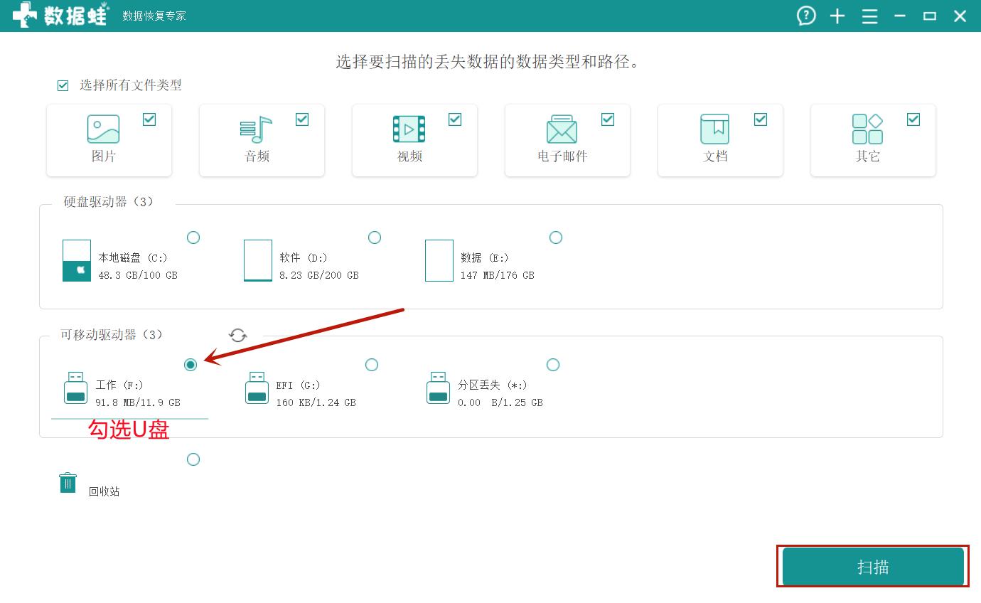 我们先把数据蛙数据恢复专家下载并安装到电脑中,把U盘接入电脑之后再打开软件,我们就可以在界面中勾选这个U盘了,然后再勾选被病毒隐藏了的文件的文件类型,点击【扫描】。