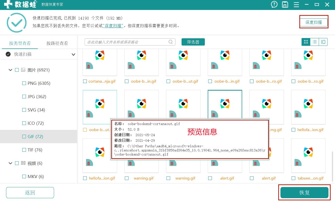 稍微等一下,快速扫描很快就会出结果。扫描出来的文件会全部放在屏幕中间,把鼠标放上去还可以看到一些预览信息,我们可以根据这些信息来找哪些文件需要被恢复。把这些文件全部勾选,点击【恢复】。