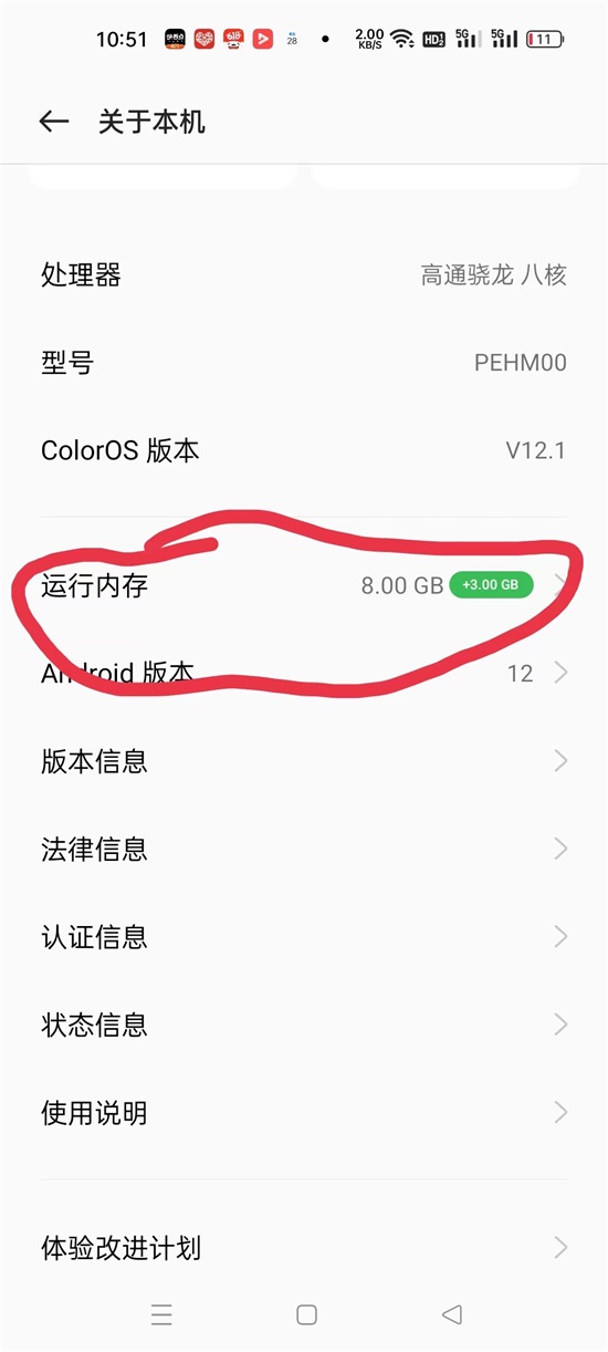,我们开机之后再点击设置——进入关于手机——再看运行内容就由刚才的6G+3G变成了6G+5G了,就变成了11G运行了,这样你的手机速度瞬间提升是不是呀,如果你看不到这个功能的情况下,我们可以通过软件升级,返回点击软件更新,来更新到你的最新软件,有的机型特别老的机型就不支持了。