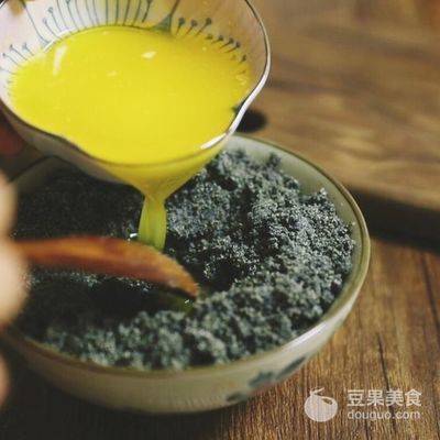 8、黄油化成液体状,分次加入打好的黑芝麻里,搅拌均匀~
