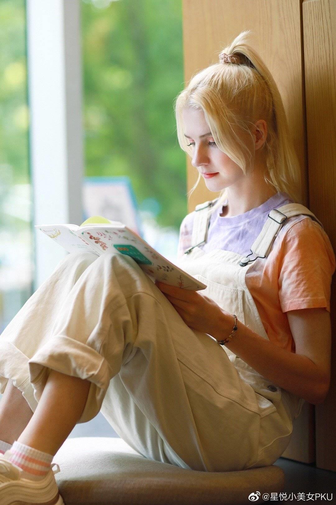 在图书馆里看书的星悦,学生气息扑面而来。一件印染的短袖,淡雅的紫色与甜美的粉色完美突显小美女的少女感。一件白色的牛仔背带连体裤,清纯又有活力,高扎马尾元气十足,大概是大家心目中初恋女孩的模样。