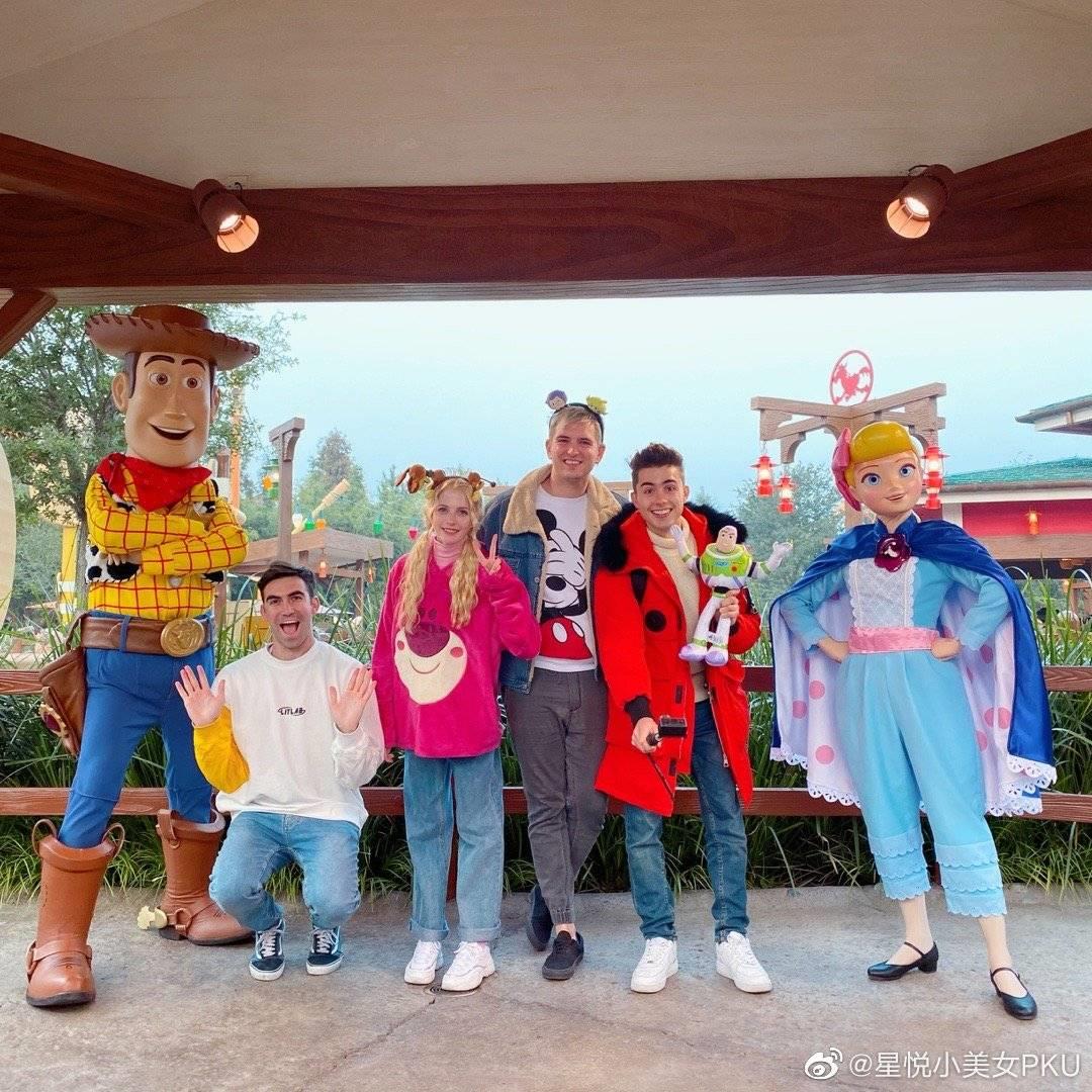 再看看去迪士尼旅游的羊毛卷星悦,玫红色的v领丝绒上衣内搭少女粉的半高领打底衣,衣服上的小熊图案十分可爱。下身是百搭的牛仔裤与白色老爹鞋,元气满满。一头金发扎成双低马尾,头戴弹簧玩具狗发饰的星悦简直可爱爆表!