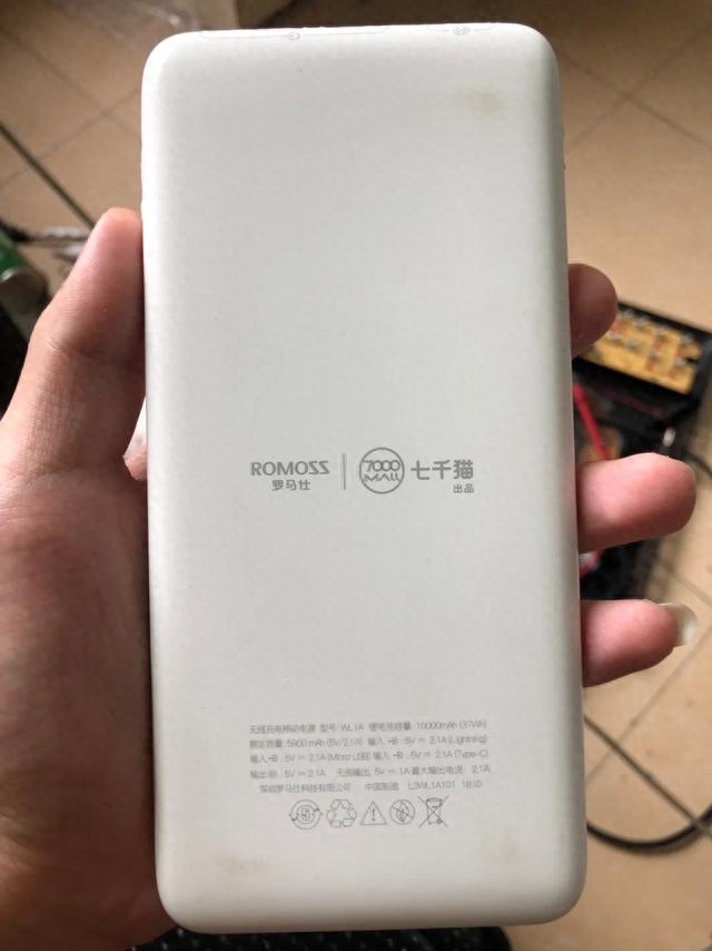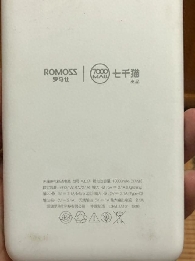 这是充电宝的正面,颜值还可以。上面是无线充电指示灯,中间是无线充电防滑垫,下面是罗马仕logo