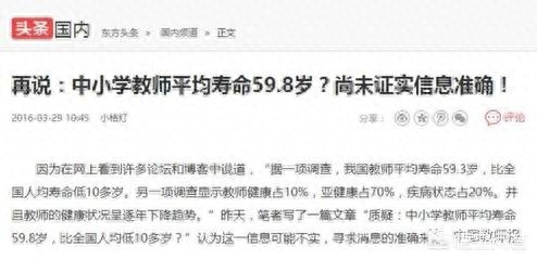 不记得是几年前,在网上看到过一篇帖子(文章),说中国的教师人均寿命59.3,然后引起不小的震动,后来,还有机构出来辟谣。