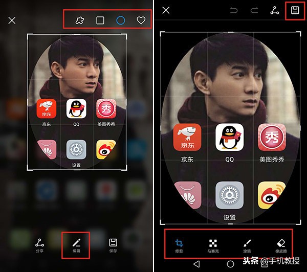 当然手残也没有关系,因为绘制完毕之后,右上角也有设定好的图形可选,目前可选的图形有方形、心形和圆形三种。此外,点击界面底部的【编辑】还能根据需求进行裁剪或者涂鸦添加文字、打码,调整好后点击保存即可。