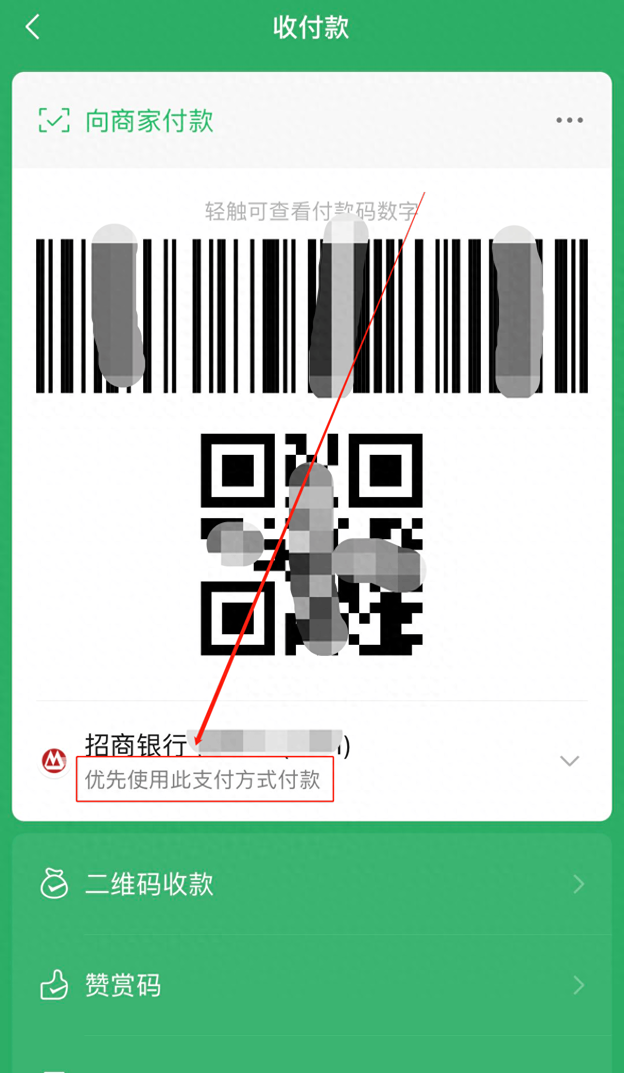 点击完“收付款”之后,界面会出现二维码。点击二维码下方的一排灰色的小字“优先使用此支付方式付款”,此时会出现“零钱”及之前绑定的所有银行卡、信用卡等。