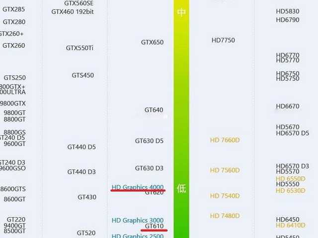 ↑贴吧中流传的显卡性能天梯图,GT610排在HD4000之下