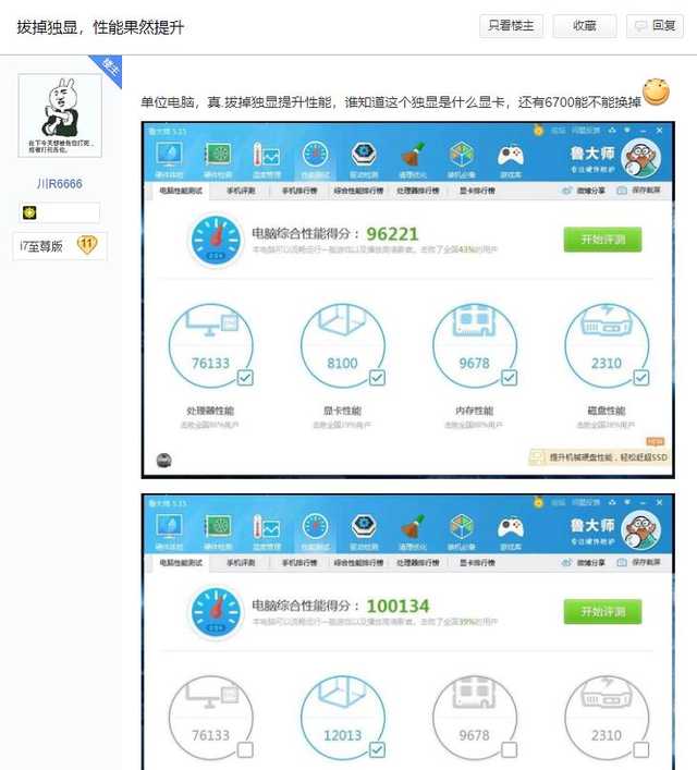 结果小白买完上网一查才发现,原来GT610的图形性能甚至还不如英特尔CPU里面自带的HD4000核芯显卡强!不可思议的是,给它拔掉以后整机性能反而还提高了……