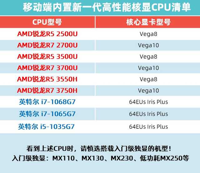 所以当大家选择电脑时候,看到以下CPU时,就请谨慎选择那些搭配入门级独显的“奇葩”机型吧(目前入门级独显大概有:MX110、MX130、MX230、低功耗MX250等3DMarkFireStrike跑分不超过3000分的显卡)。