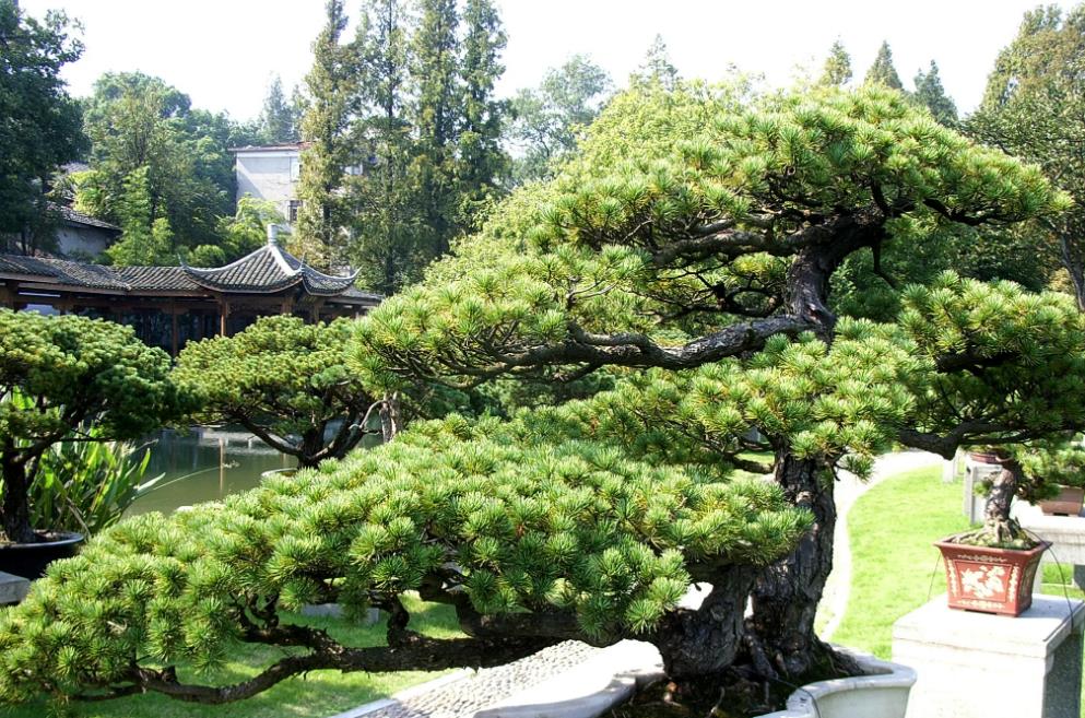 日本五针松干苍枝劲,翠叶葱笼,针叶5针一束,微弯曲,秀枝舒展,偃盖如画,为园林中珍贵的观赏树种。