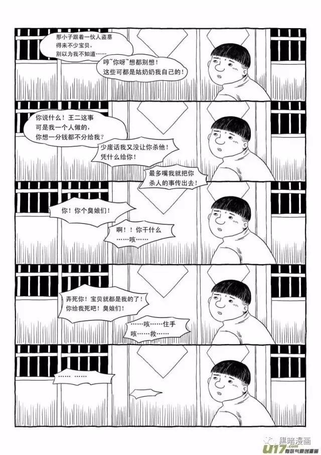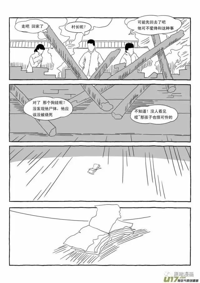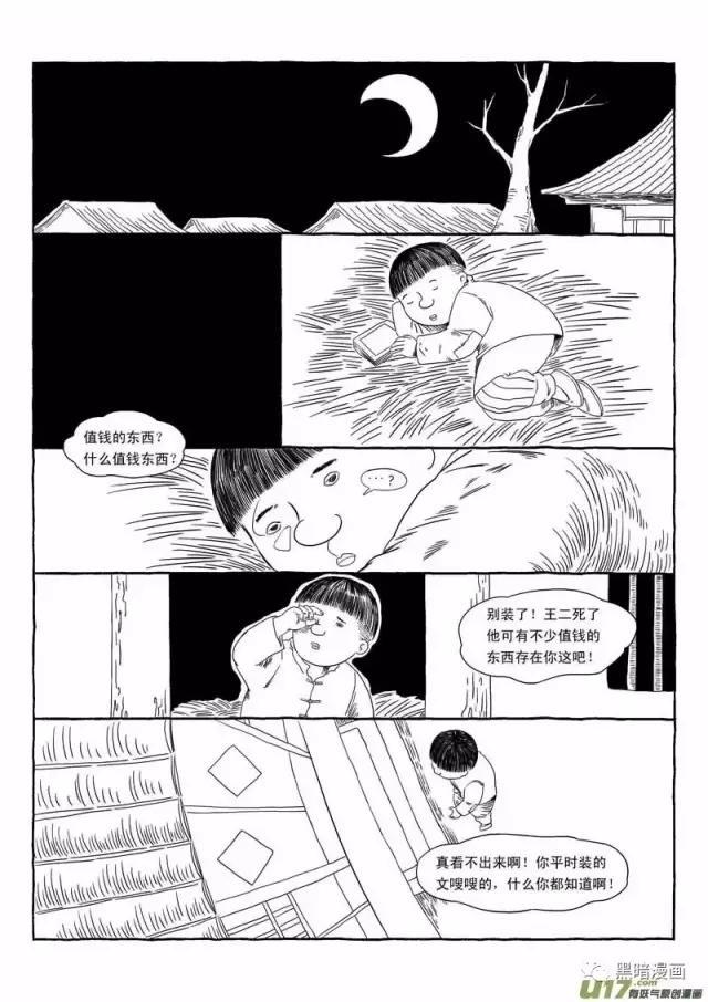 故事就是王二盗墓的钱放在了狗妈那里,而教书先生知道了这件事并且加害了王二父子,想要钱的时候狗妈反悔了,想要独吞,教书先生就杀了狗妈,还杀了无意看到事情的狗娃,导致房子被火烧了,最后连村长都被狼吃掉了。