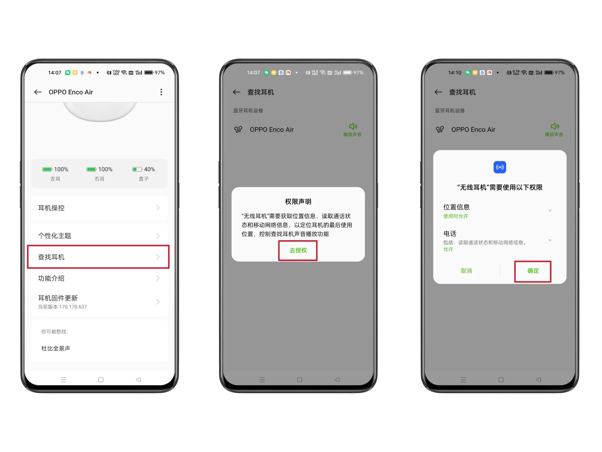 15、点击【查找耳机】进入,会有「权限声明」提示:“无线耳机”需要获取位置信息、读取通话状态和移动网络信息,以定位耳机的最后使用位置,控制查找耳机声音播放功能。点击【去授权】,点击【确定】“无线耳机”需要使用的【位置信息】和【电话】权限。