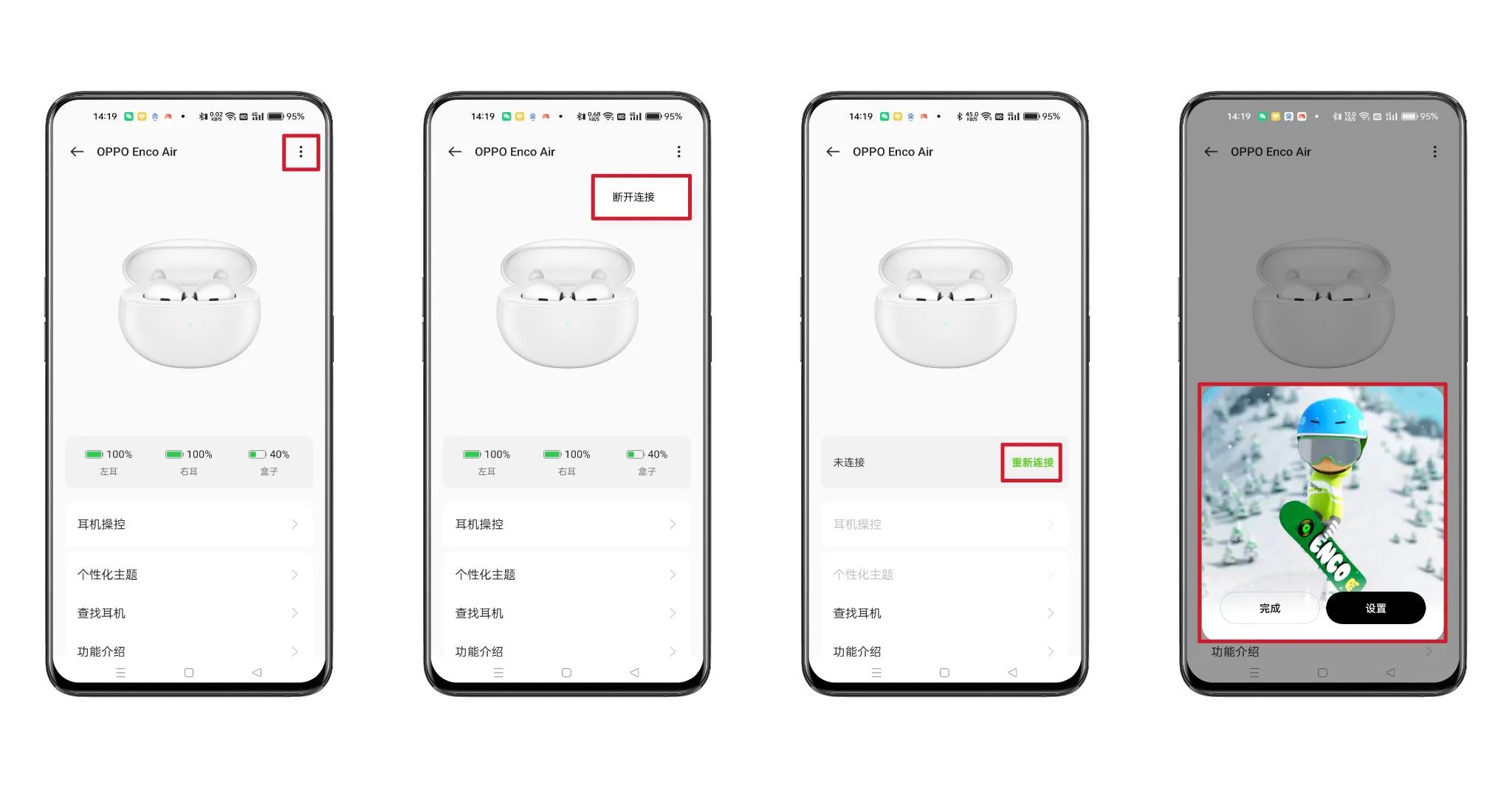 21、在桌面直接进入【设备总览】页面后,点击右上角三个点图标,可以选择【断开连接】,点击【重新连接】,就能自动与蓝牙耳机设备建立连接,也会有之前设置的弹窗动画显示。