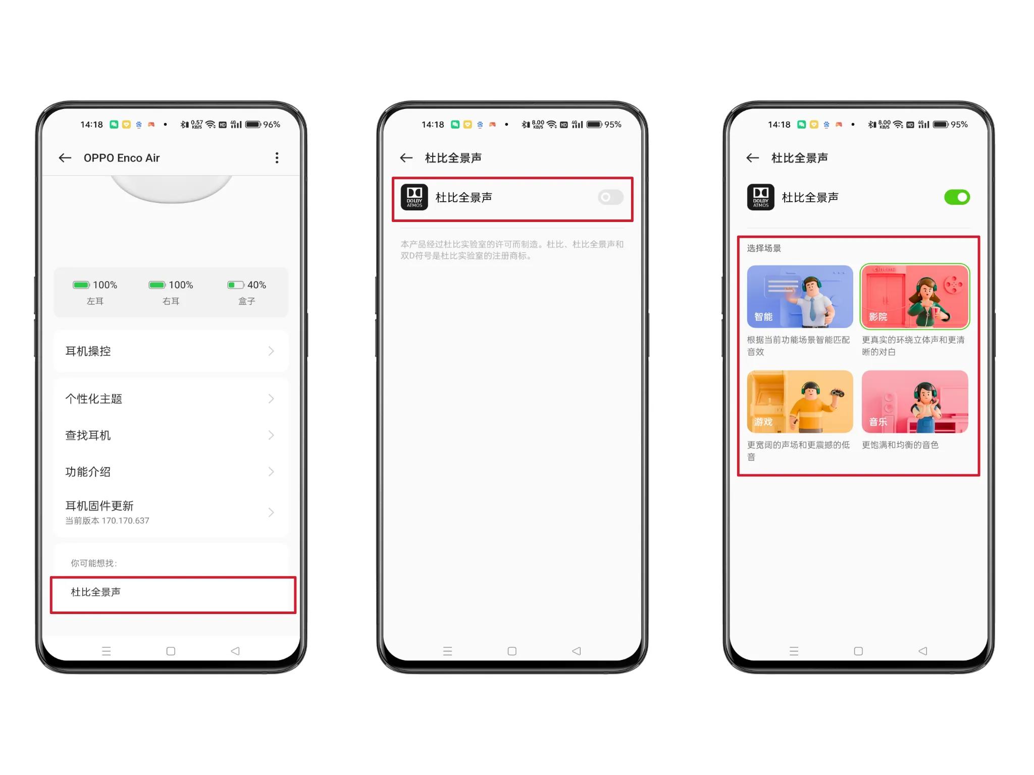 20、点击【杜比全景声】进入,可以开启【杜比全景声】功能,还能根据使用习惯选择不同的场景,比如【智能】/【影院】/【游戏】/【音乐】。