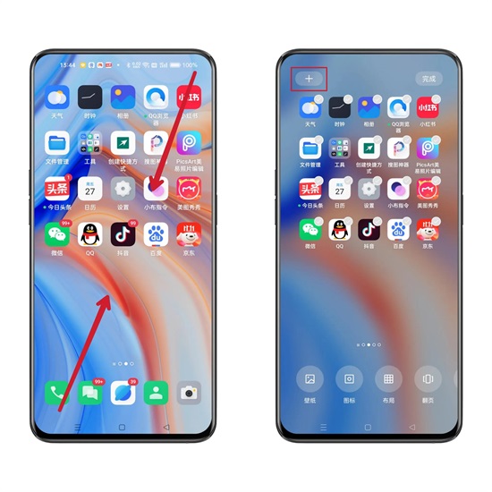 4、将手机升级到ColorOS 12系统版本后,就可以进行添加桌面卡片的操作了,其实就是咱们平时提到的桌面插件,插件属于桌面小部件,也叫桌面控件,是一种能够直接显示在Android系统桌面上的小程序,以ColorOS 12及以上版本的手机为例,可以双指放在屏幕斜对角,向内捏合进入桌面编辑界面,需要在左上角点击+号进入。