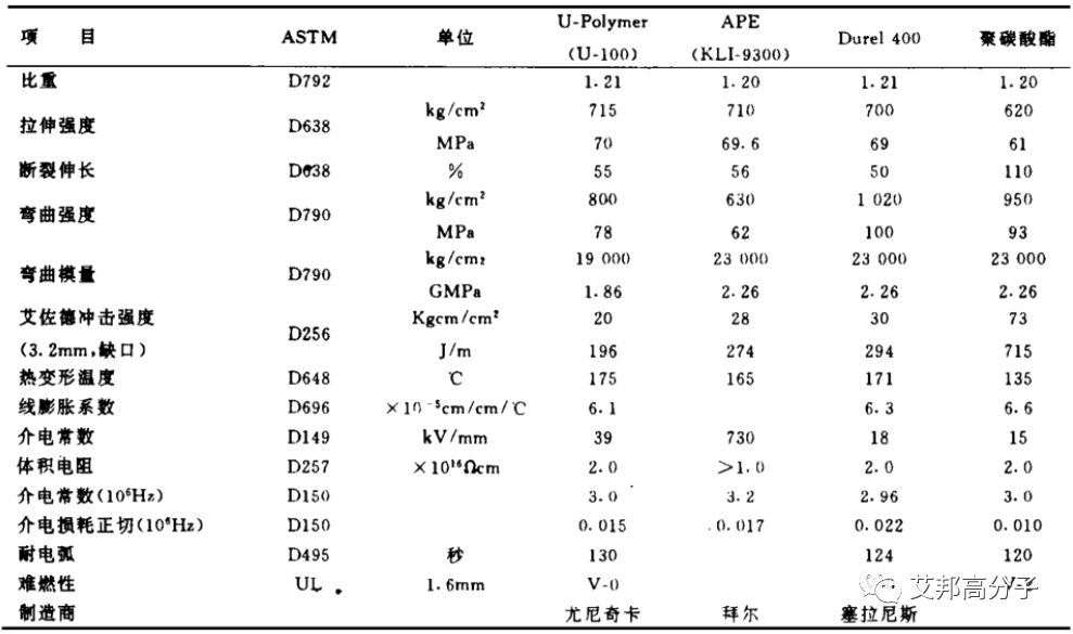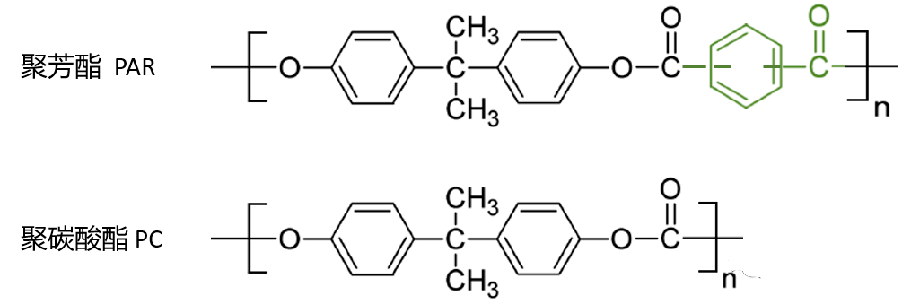 PAR结构与PC相似,其性能大体一样,可共用模具成型,但PAR的主链上芳环密度高,使得PAR耐热性比PC更好,热变形温度比PC高20~40℃,且耐紫外线性、耐蠕变性优异。但断裂伸长率和抗冲击性能不如聚碳酸酯。