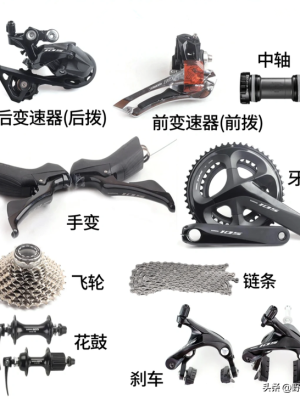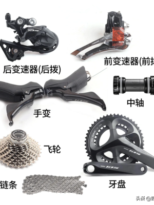 说完作用轮组,我们继续公路车的控速系统。它包括手变、前拨、后拨、刹车、牙盘、飞轮、中轴构造、曲柄等。