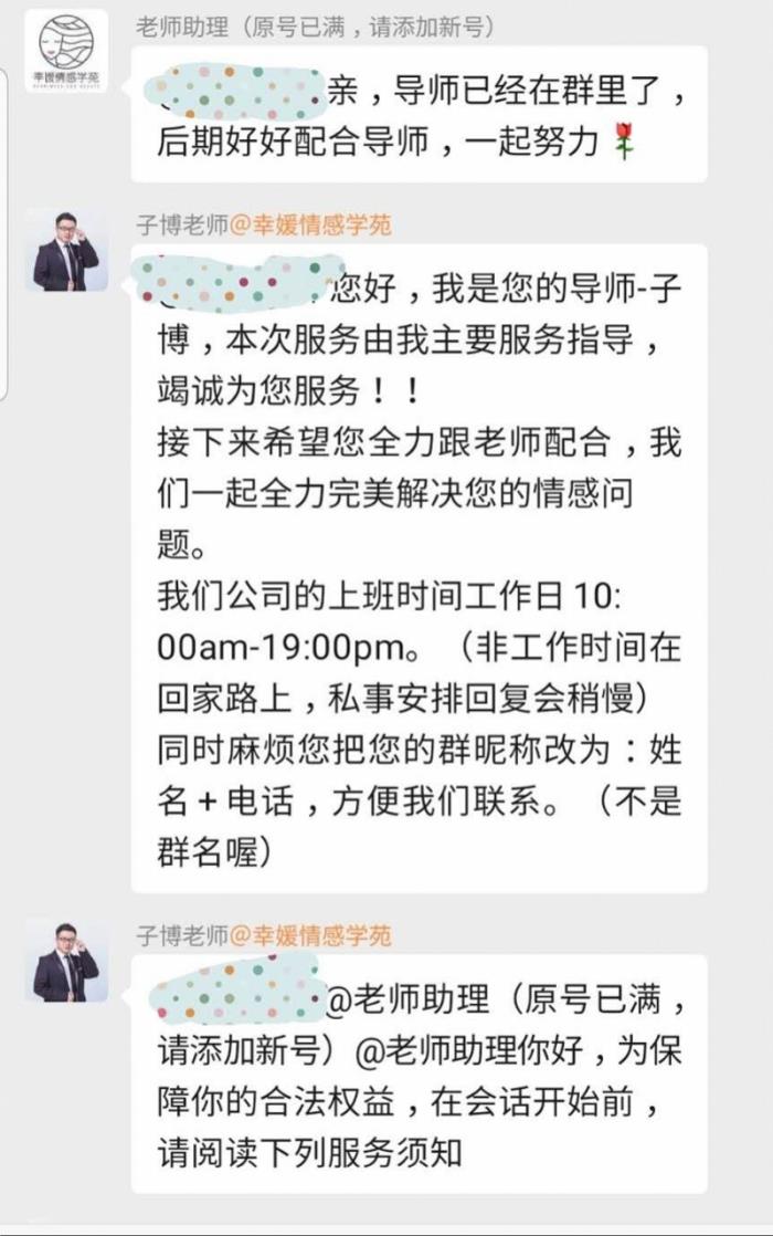 购买VIP会员后,柳斐添加了一位“幸媛情感学苑”的助理。该助理分析称,柳斐的问题需要一对一导师的电话和微信沟通才能解决。在助理的推荐下,她又交了99元,与一名所谓机构中的专业导师取得了联系。该导师告诉柳斐,他们做过很多此类情感挽回的项目,挽回的几率很高,“一定要对自己有信心,不挽回的话可惜了”。同时该导师又提供了新的情感挽回套餐,表示买下套餐后会有一对一的导师指导柳斐。