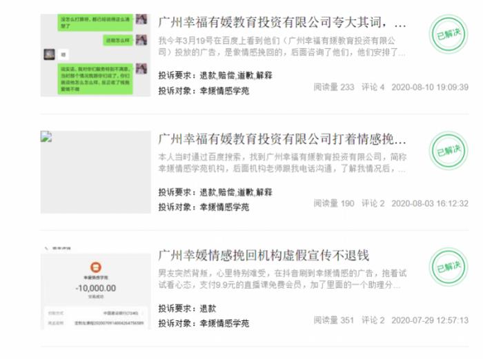 8月中旬,记者在聚投诉平台上看到,“幸媛情感学苑”的总投诉量达到50起,投诉从2025年上半年就有。从可观察的数据看,投诉者以女性居多,咨询的时间集中在刚与恋人分手,想要挽回;均在不同的新媒体平台上看到“幸媛情感学苑”的广告。她们所投诉的问题多是:该机构涉嫌诱导付费、误导宣传、霸王条款、挽回过程未予本人期望一致,服务与收费不成比例。