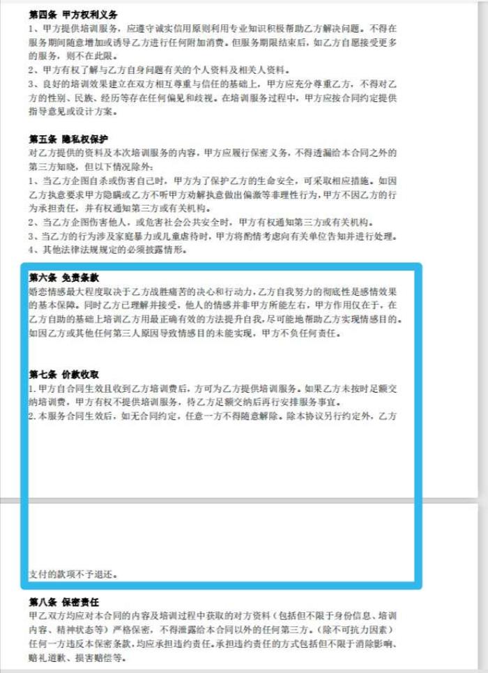 另外,在“免责条款”和“价款收取”两项,合同称,“乙方自我努力的彻底性是感情效果的基本保障”,如果因乙方或其他任何第三人原因导致情感目的未能实现,甲方不负任何责任;合同生效后,除本协议另行约定,乙方支付的款项不予退还。