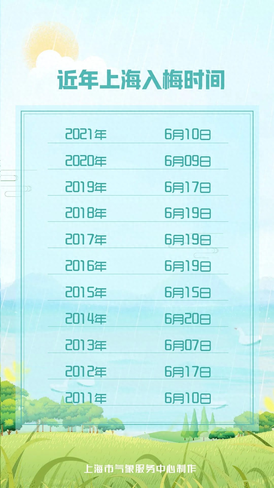 有气象记录以来徐家汇站最早入梅时间为5月22日(1936年)最晚入梅为7月9日(1982年)今年较常年平均偏早