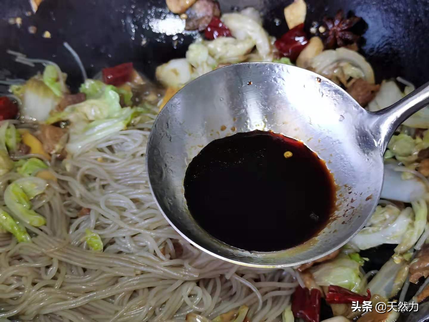 13、把白菜翻炒均匀后改小火,把红薯粉倒进锅内。