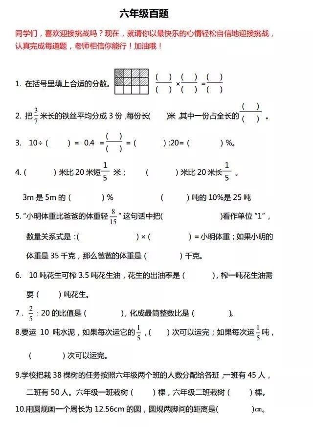 六年级数学经典题100道,暑假务必给孩子练练
