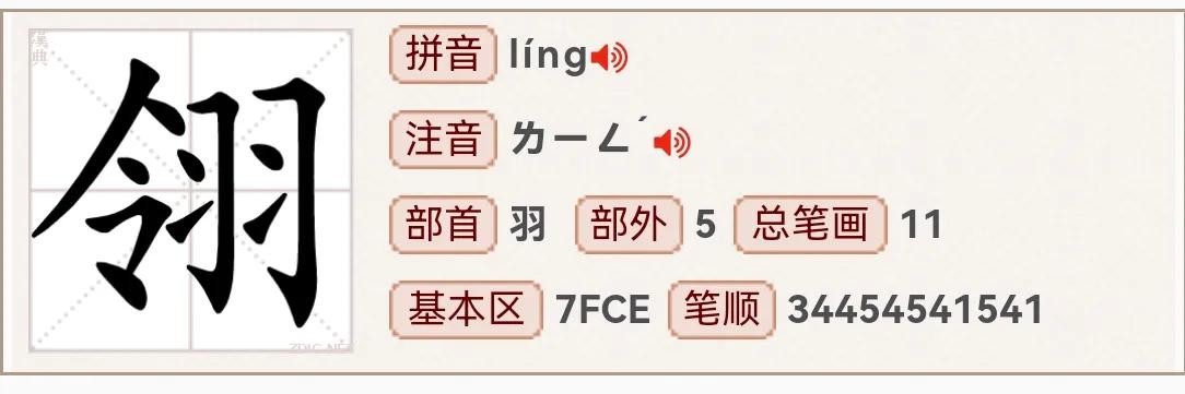 读音为“líng”,同音字“玲”,部首为“羽”,总笔画11,左右结构。