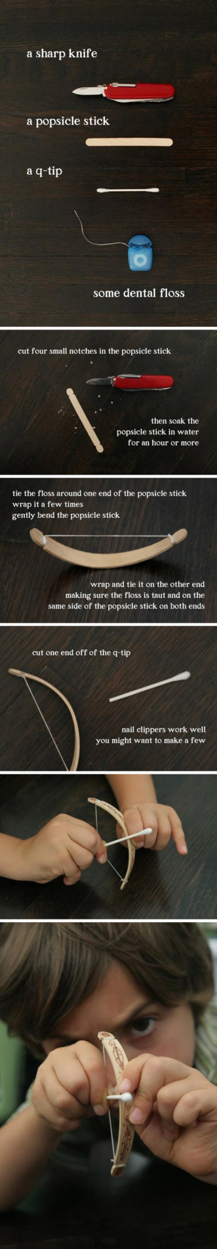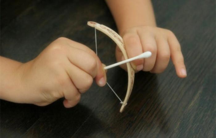 棉签和雪糕棍diy做成的小弓箭,喜欢的可以做来给宝宝玩,棉签头软软的,不怕会伤到小朋友哦。材料:棉签、雪糕棍、棉线绳