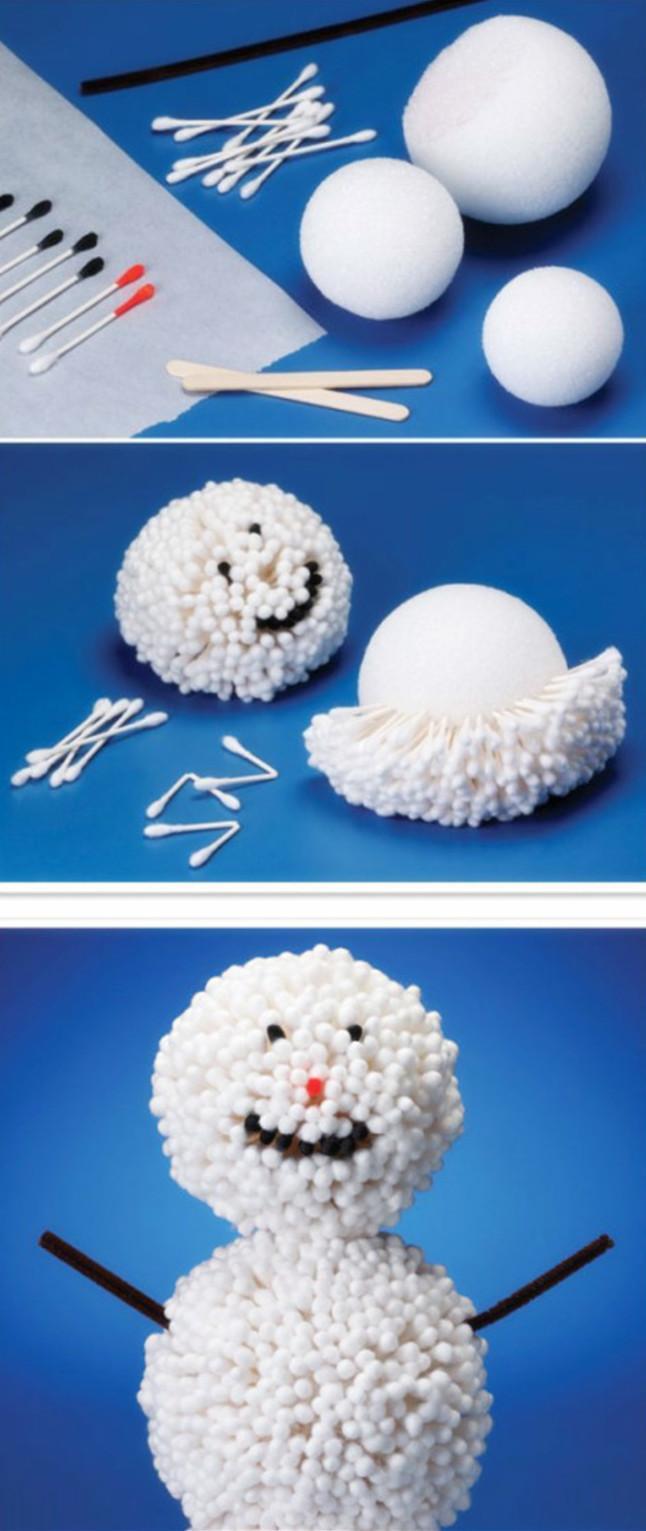 做个小雪人也很好玩的。步骤:取适量的棉签,从中间对折折断,挑几根染成红色和黑色,把棉签均匀地插在泡沫球上(可以用超轻粘土自己做),红色棉签插出嘴巴的形状,黑色眼睛的形状。再选一个大一些的泡沫球,插上棉签。两个泡沫球中间用牙签连接。