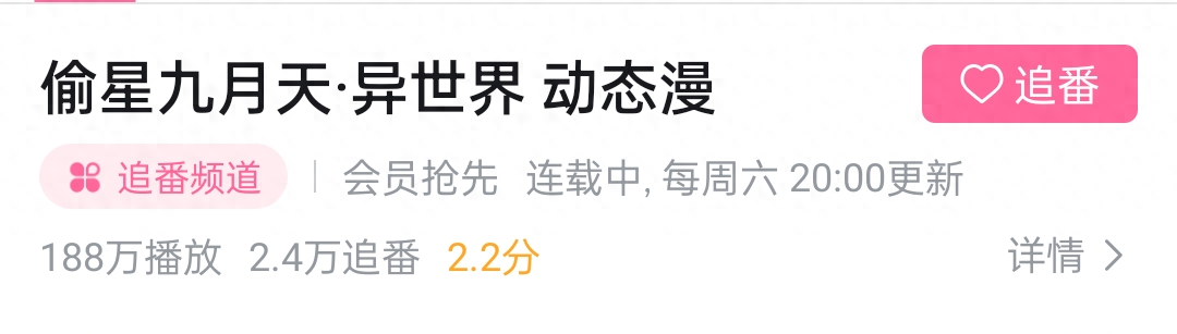 现在PV出来了,豆瓣上动画还没有具体的播出时间,只是显示在2022年会出,现在每周六更新的也只是动态漫。不过,《偷星九月天》漫画怎么来说也是一部经典国漫,所以本着对国漫的支持,不管CP如何能做出动画也是很不错了。