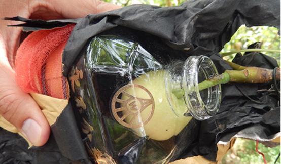 2、在梨树果子还小的时候,就把它放入酒瓶中,经过养护管理,在酒瓶中逐渐成熟,然后再进行摘取和灌装,并将梨标注与标签上。